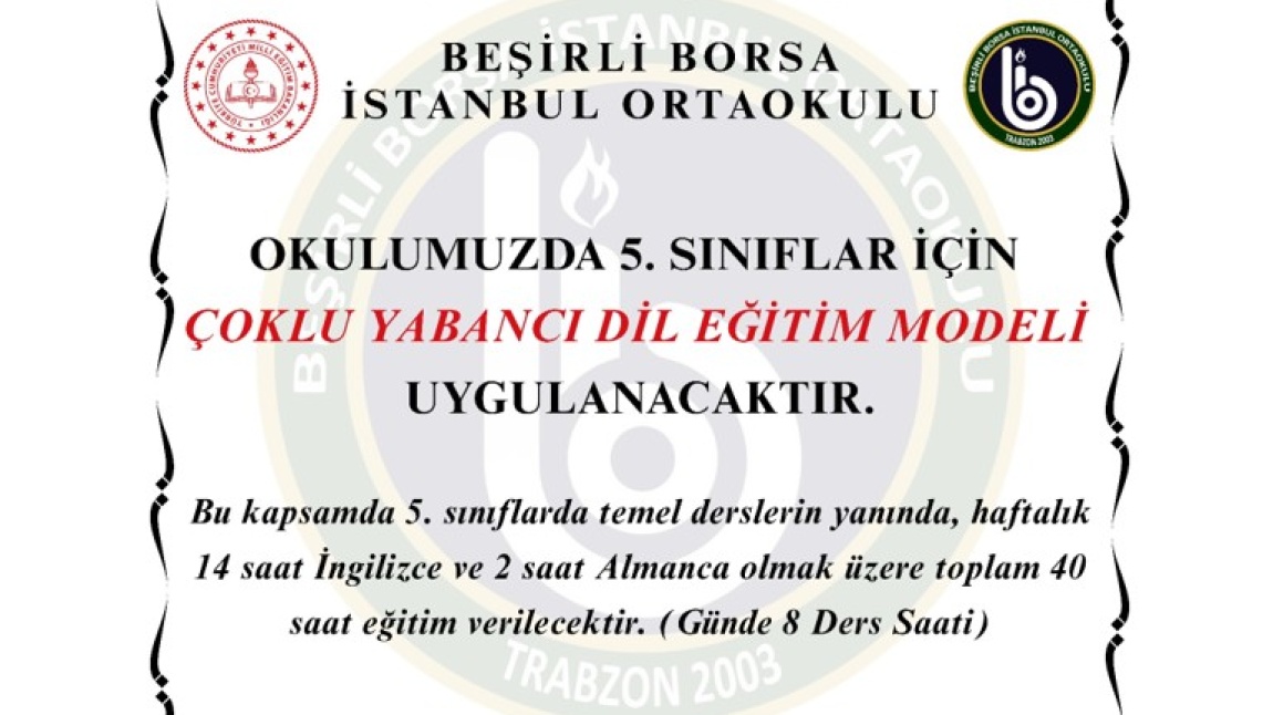Okulumuzda 2025 -2026 Eğitim Öğretim Yılında 5. Sınıf öğrencilerimiz için "Çoklu Yabancı Dil Eğitimi" Modeli uygulanacaktır.